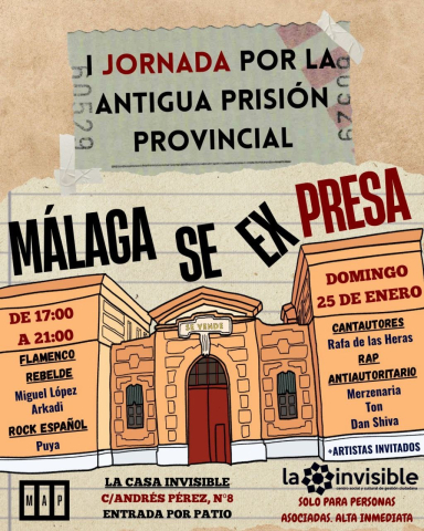 Conoce la antigua prisión provincial, la historia viva que se quiere borrar. Conoce a los presos que la habitaron y que esa tarde también serán protagonistas. Conoce a los responsables que quieren transformar a Málaga en una ciudad dormitorio, un espacio solo apto para el consumo.