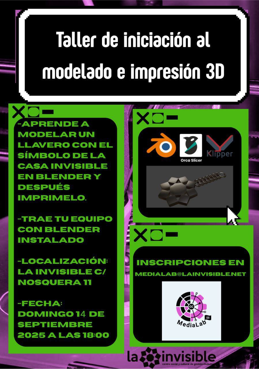 -Entra en el mundo del modelado 3D en blender y aprende como funciona la impresión 3D con este taller de iniciación en La Casa invisible (C/ Nosquera 11) el Domingo 14 de Septiembre de 2025 a las 18:00.
