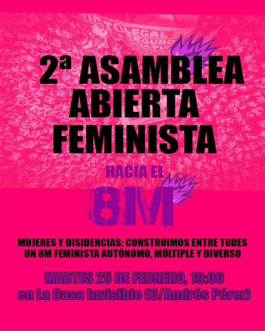 Tuesday, 25 February, 2025 - 19:30 Segunda y última asamblea previa de organización para el 8M desde los feminismos autónomos Ven y organízate con nosotras. En la Casa Invisible (entrada por Andrés Pérez) Martes 25 de febrero 19.30h