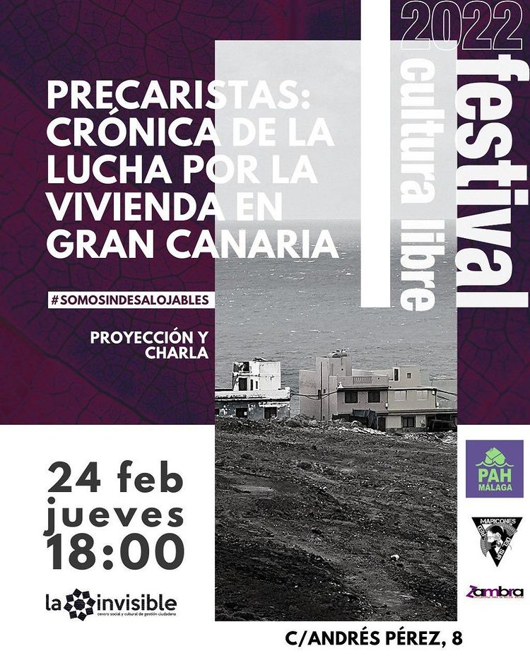 Precaristas es un documental sobre la lucha por el acceso a la vivienda que están llevando acabo las vecinas del Sindicato de Inquilinas de Gran Canaria. Su objetivo es presentar algunos de los proyectos de vivienda autogestionados que existen en la isla como La Comunidad Esperanza, El Refugio y La Ilusión, entre otros. Proyectos organizados y habitados por personas pobres y en riesgo de exclusión social; familias golpeadas por la "crisis", paradas de larga duración, migrantes sin papeles y madres con menores a cargo que han sido víctimas de violencia machista. El documental se estrenó hace dos años pero su temática no pierde vigencia en muchas ciudades y pueblos en todo el Estado Español. Además de ver el documental, abriremos un debate donde compartiremos experiencias sobre la lucha por la vivienda digna en Málaga.