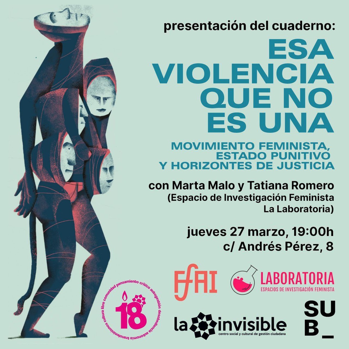 Tras este 8M y en el marco del 18 aniversario de la Casa Invisible, presentamos el cuaderno «Esa violencia que no es una. Movimiento feminista, estado punitivo y otros horizontes de justicia», un cuaderno coral que, desde la cercanía, los conflictos y las luchas cotidianas feministas de distintos territorios, desarma la idea de una única violencia y revela el entramado de violencias patriarcales, económicas, judiciales, racistas y coloniales que sostienen la guerra contra nuestras vidas.