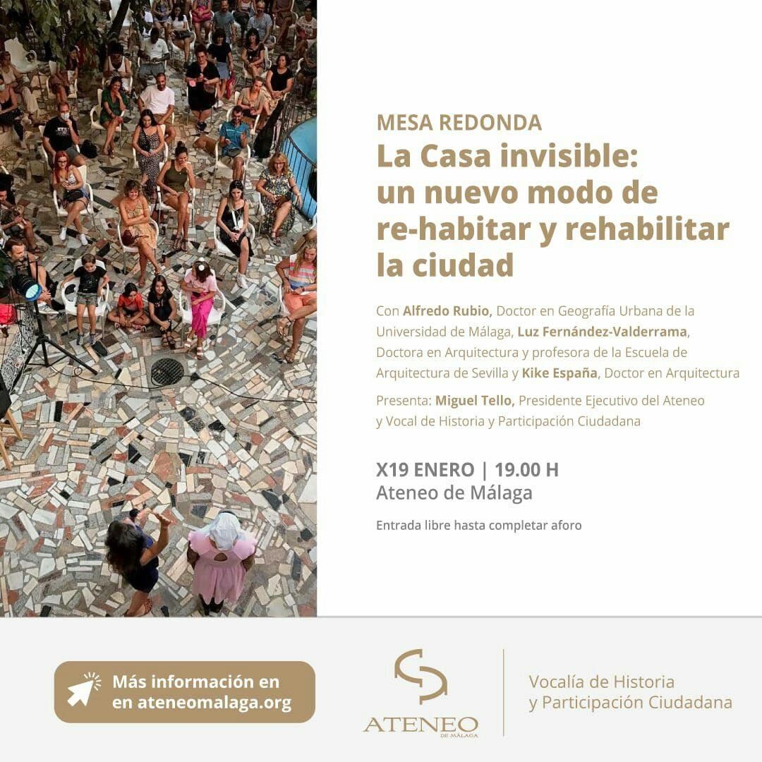 El próximo miércoles 19 a las 19 hay un planazo en el Ateneo de Málaga, Mesa redonda “La Casa invisible: un nuevo modo de re-habitar y rehabilitar la ciudad”.