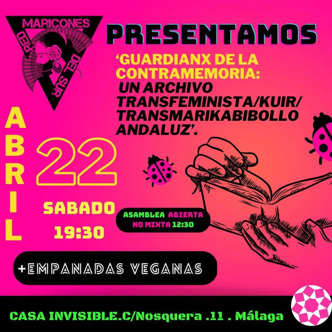 19.30 - Presentación del archivo digital "Guardianxs de la contramemoria". Memoria de la disidencia sexual y de género en Andalucía y sus organizaciones. Charla informativa y espacio de diálogo. Evento abierto y mixto con tapeo vegano.
