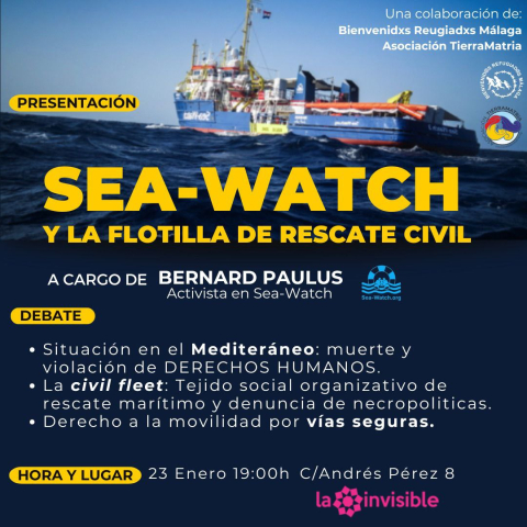 Este 23 de enero, acompáñanos a escuchar a Bernard Paulus, activista de Sea-Watch, quien compartirá su experiencia y reflexionará sobre temas como el derecho a la movilidad, las vías seguras y el nuevo Pacto Europeo de Migraciones.