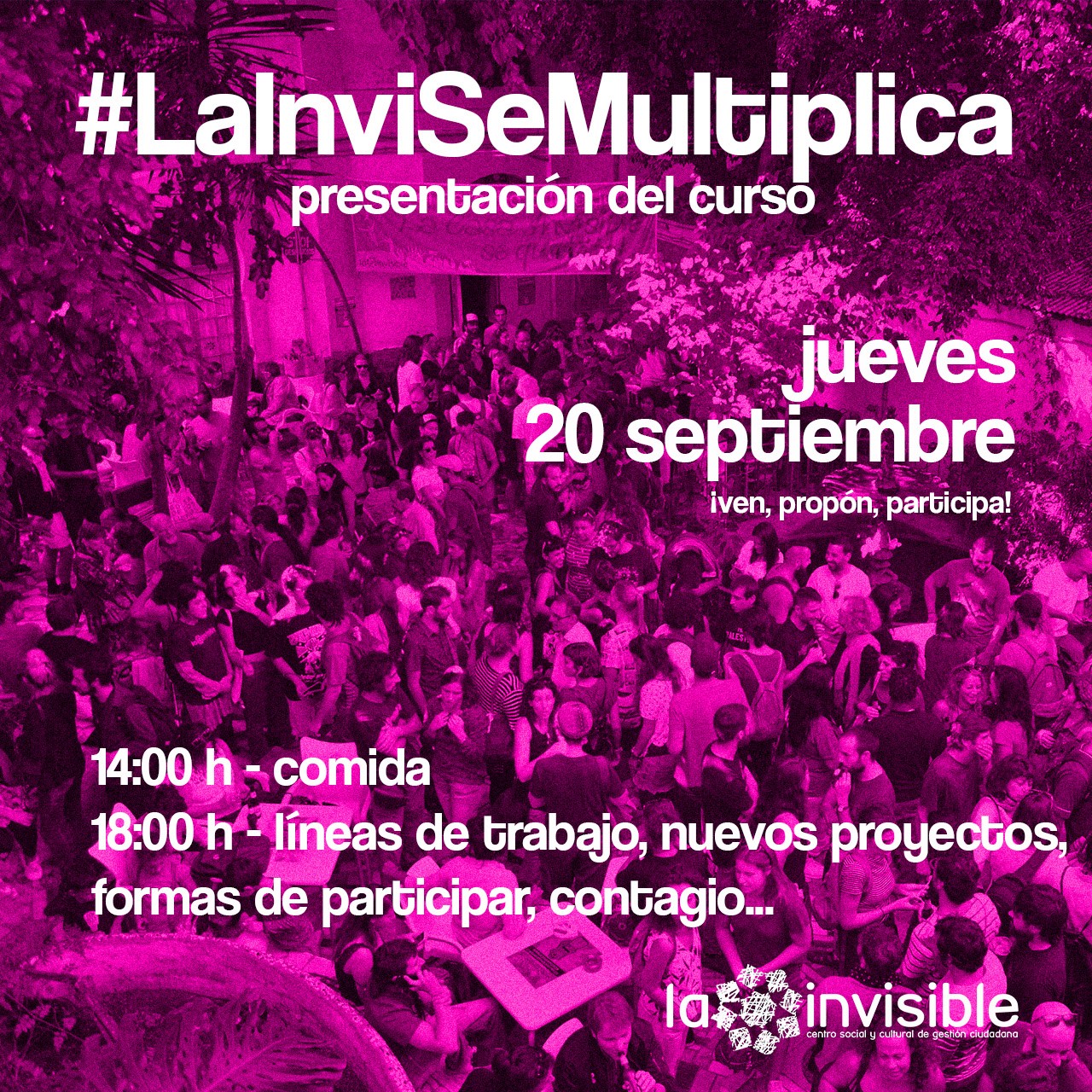 Por esto os convocamos a todas a venir el día 20 de Septiembre a la inauguración pública del curso, con una presentación de la situación de la negociaciones con el ayuntamiento, la programación cultural y los proyectos de esta nueva etapa. También será un buen lugar para traer propuestas, que recogeremos para ver como llevarlas acabo. Queremos que La Invisible tenga lugar en la ciudad y que toda la ciudadanía tengamos lugar en La Invisible. Será un día de convivencia, con paella desde las 14h. A las 18h tendrá lugar la presentación del proyecto del curso. También esperemos que sea un momento de alegría donde celebrar que estamos juntas y que juntas podemos todo!